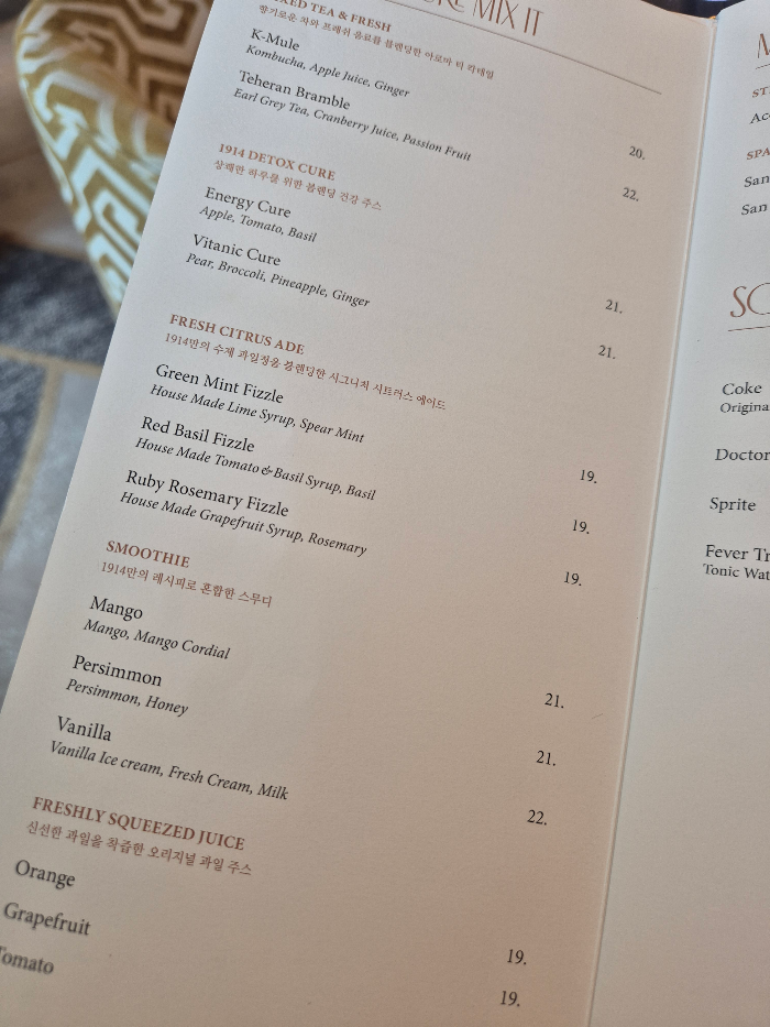 1914 라운지바의 메뉴는 다양하고 독특한 음료들로 구성되어 있습니다. 시그니처 칵테일과 조선 팰리스만의 애프터눈 티는 특히 추천할 만한 메뉴입니다.