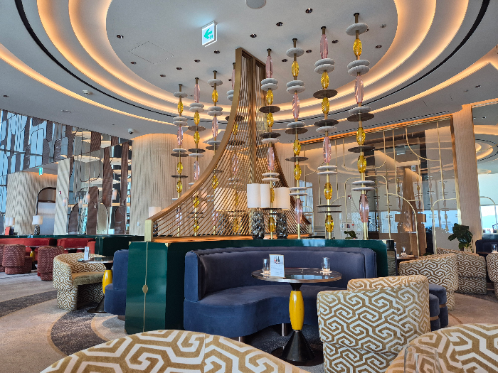 1914 라운지바의 인테리어는 현대적이면서도 우아한 느낌을 주는 요소들로 가득 차 있습니다. 곡선 형태의 디자인과 고급스러운 조명은 이곳의 매력을 한층 더해줍니다. 또한, 대형 창문을 통해 들어오는 자연광은 공간을 더욱 밝고 쾌적하게 만들어 줍니다.